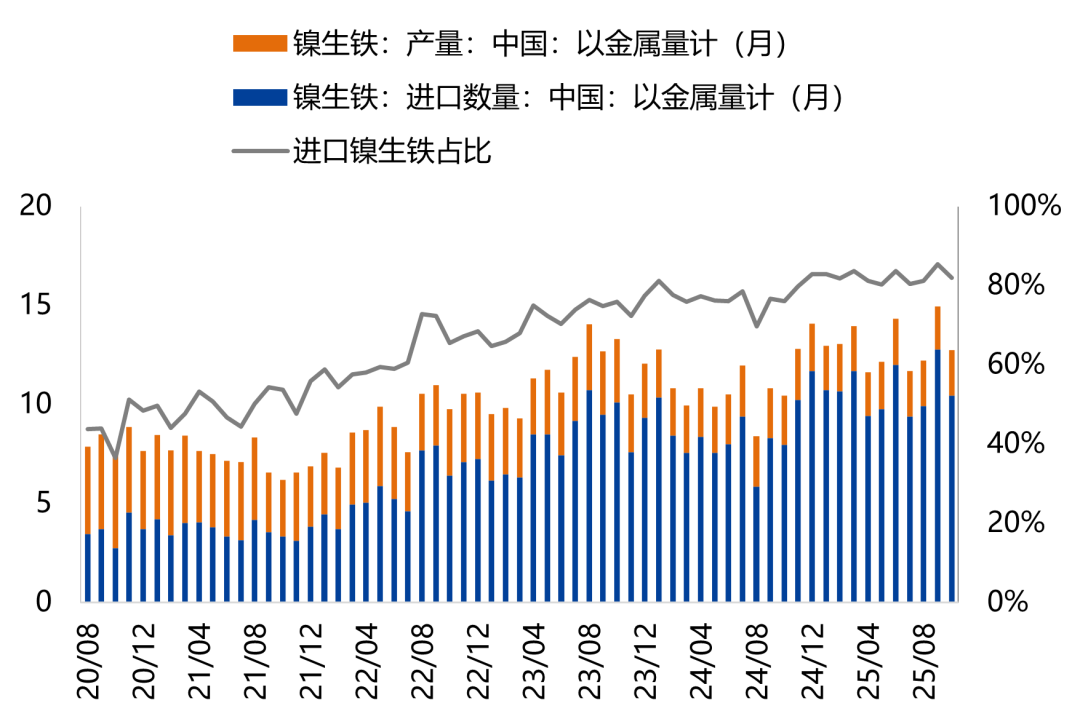 总量来看,镍铁产能维持稳定,利润持续走弱的背景下新增项目增长停滞,但产能过剩问题较为突出,2025年印尼、中国镍铁开工率仅有78%和46%左右。结构方面,印尼进口镍铁继续挤占国内市场,25年进口镍铁量占比已稳定在80%以上,1-11月国产镍铁产量同比下滑近8%。