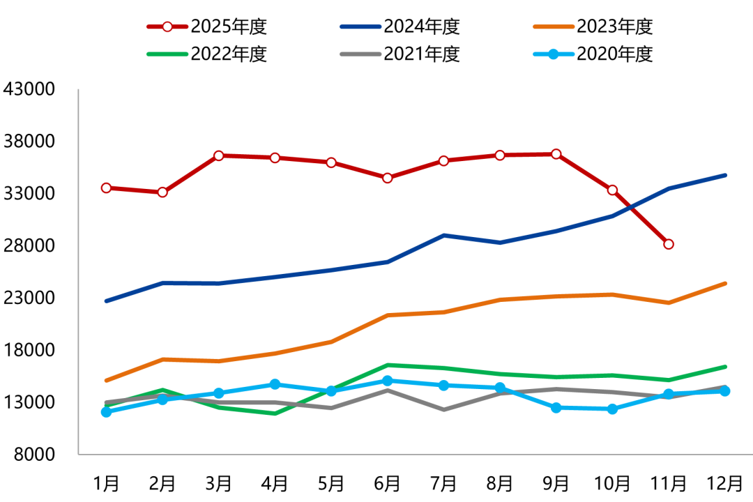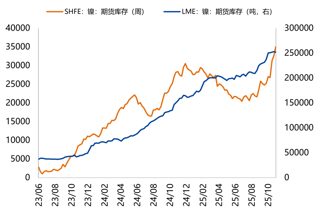 在6月至10月的4个月时间里,镍价持续在12万元上下窄幅震荡。一方面,关税担忧缓和、美联储降息预期、以及新能源汽车需求旺盛对镍价下方形成支撑,另一方面高库存与供应过剩压力持续压制上方空间。直至11月,年内印尼矿端收紧预期落空,且下游步入淡季,需求表现疲软、过剩矛盾进一步发酵带动镍价下探,截至目前镍价最低跌破11.2万元。