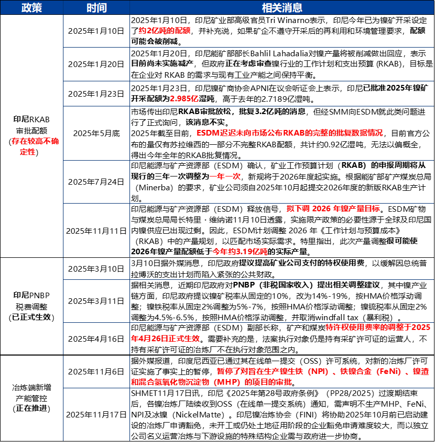 MHP仍有新增产能规划中,但25年11月,印尼通过其在线单一提交(OSS)许可系统,暂停了新增镍生铁、水淬镍和MHP冶炼厂的许可证审批,该政策若持续、严格实施,或遏制中间品供应的扩张,关注后续MHP新增产能的实际进展。