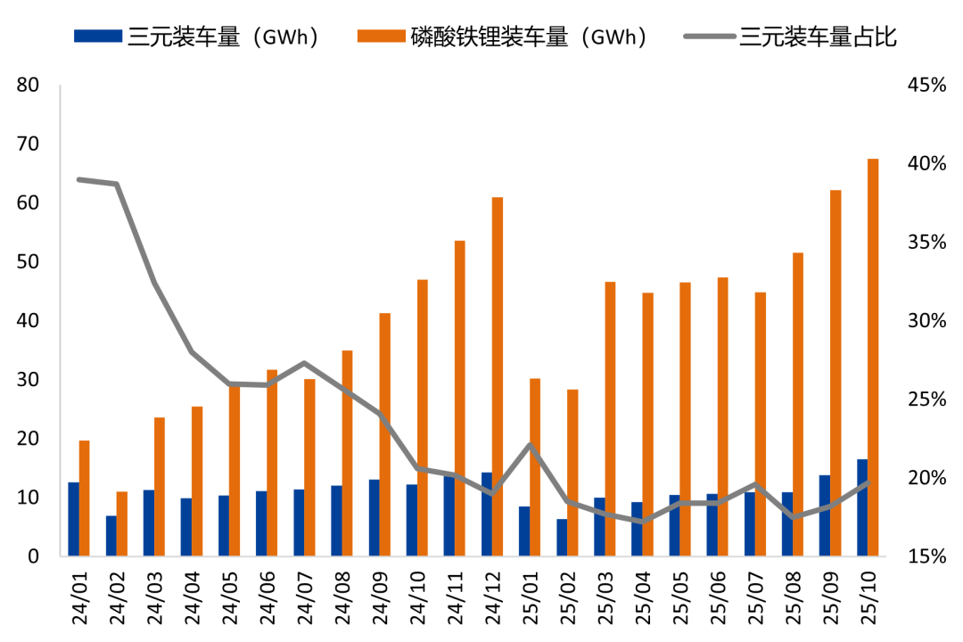 今年新能源需求旺盛,三元前驱体产量重回2022年的高位水平,截至11月,三元产量较24年同比增长11.41%。但25年以来,新能源汽车的三元电池装车量占比维持在20%以下,装车结构严重制约了新能源部分的需求增量。