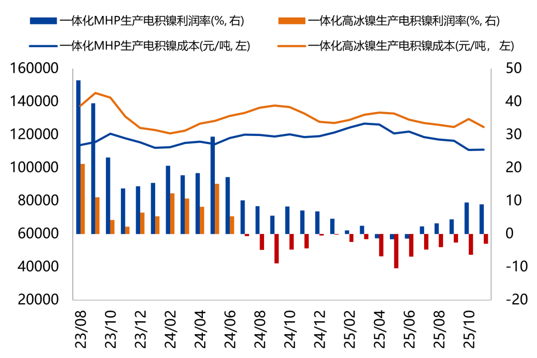 从产量趋势来看,国内精炼镍高速扩张阶段已步入尾声,但25年全年精炼镍月产量基本保持在3.3万吨以上,维持高位水平,截至11月国内精炼镍生产同比增长27.2%。从生产利润的角度,一体化高冰镍生产电积镍已有亏损,但MHP生产电积镍仍有盈利空间。考虑到当前精炼镍仍是镍产业链中附加值最高的产成品,若镍元素显著过剩格局延续,则将继续流向精炼镍环节,加剧精炼镍库存压力。