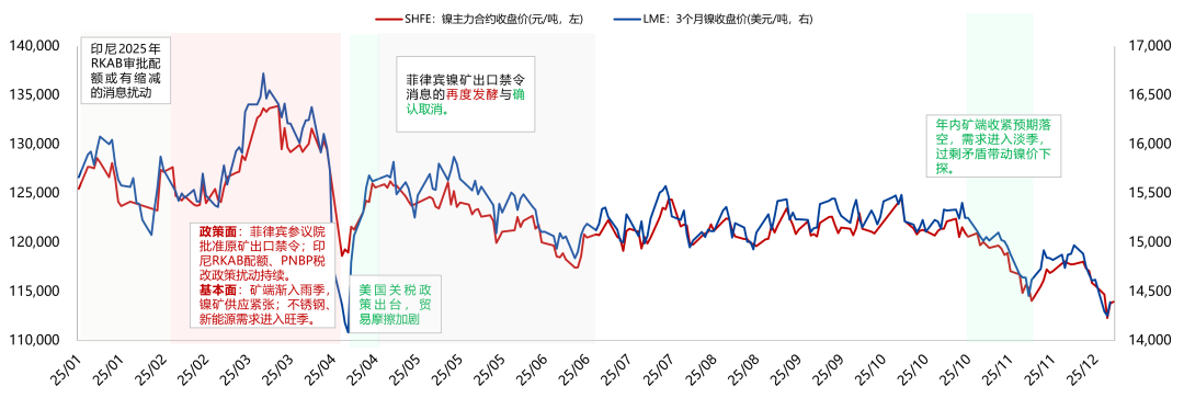 2025年,镍供需过剩格局延续,价格重心下移至12万元以下。展望2026,资源国政策依然是基本面的主要变量。