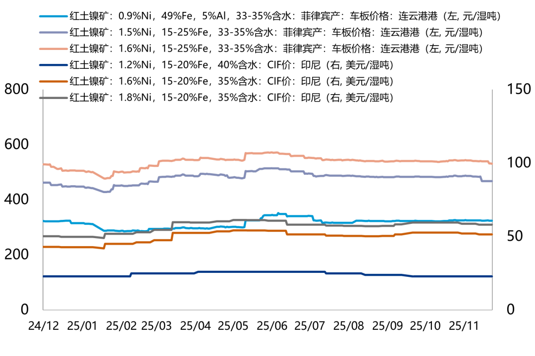 从量的维度,今年镍矿实际供应较为宽松。一方面,今年印尼RKAB审批量虽未公布最终数据,但至少在2.985亿湿吨以上,高于去年约2.7189亿湿吨的年产量。另一方面,印尼今年显著增加了对菲律宾镍矿的进口,补足国内阶段性的供需缺口,2025年截至10月印尼进口菲矿同比增长36.4%,增加359万吨。