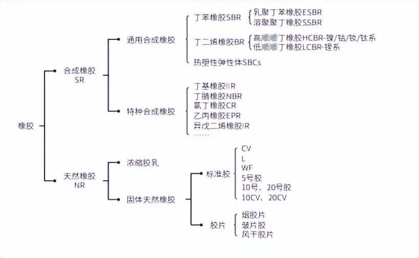 合成橡胶按成品状态的不同可分为液体橡胶、固体橡胶、乳胶和粉末橡胶 等;按照用途的不同,可分为通用合成橡胶与特种合成橡胶两大类。目前,丁二 烯橡胶(BR)与丁苯橡胶(SBR)是应用最为广泛的两大合成橡胶品种。