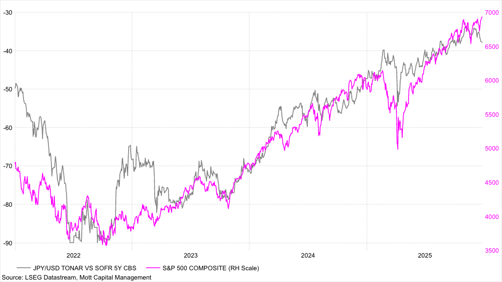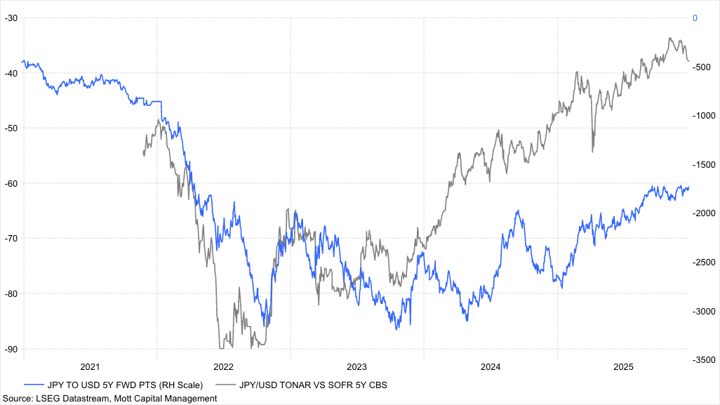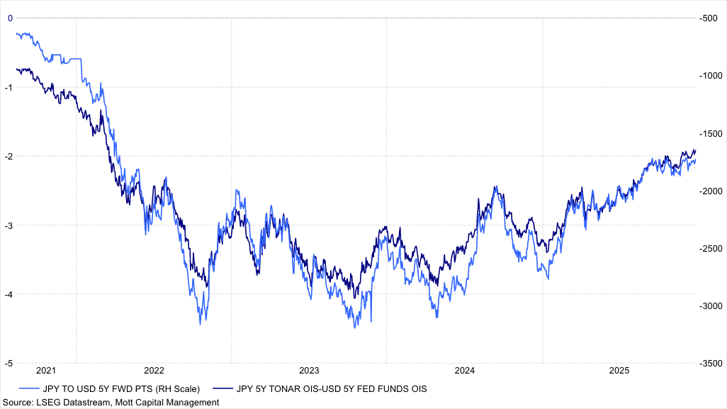 日元走弱的一个原因,可能是投资者正在增加对美元计价资产的配置,并且未对这些头寸进行汇率对冲。然而,只要投资者仍能从美股中获得额外回报,套利交易就可能继续存在。过去四年中,五年期交叉货币基差互换与标普500指数表现出高度相关性,而日元套利交易似乎也推动了美国股市的上涨。在过去四年日元持续走弱的背景下,对冲并无必要,因此美元融资成本持续下降。