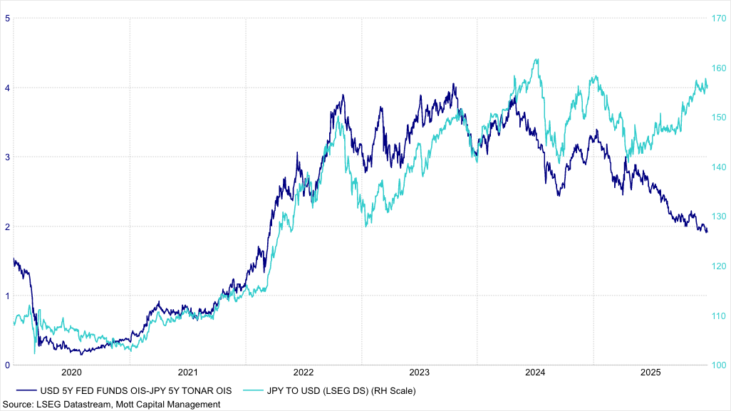 更高的日本五年期利率将意味着美日利差将明显收窄,除非美国利率与日本利率同步上升、甚至上升得更快。但鉴于市场预计美联储将在2026年降息,美国利率上行速度快于日本的可能性似乎并不大。