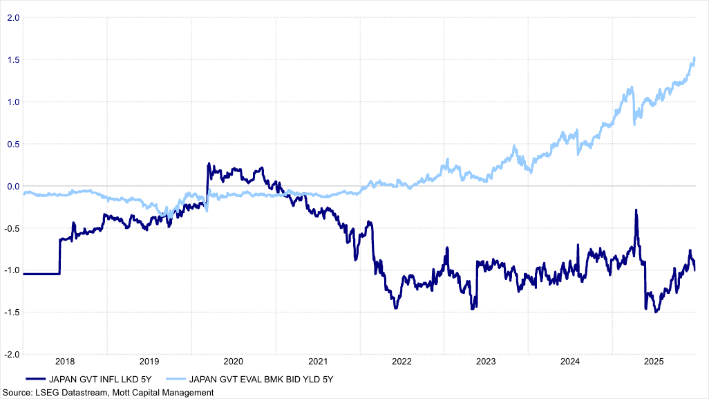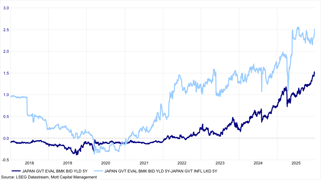总体而言,要使日本的实际利率转为正值,五年期名义利率需要升至约2.5%以上,这一水平相当于假设的盈亏平衡通胀率,也是当前名义利率与实际利率之间的差值。这意味着,如果日本央行最终目标是将利率推升至正区间,日本五年期利率在未来几个月可能仍需要显著上行。