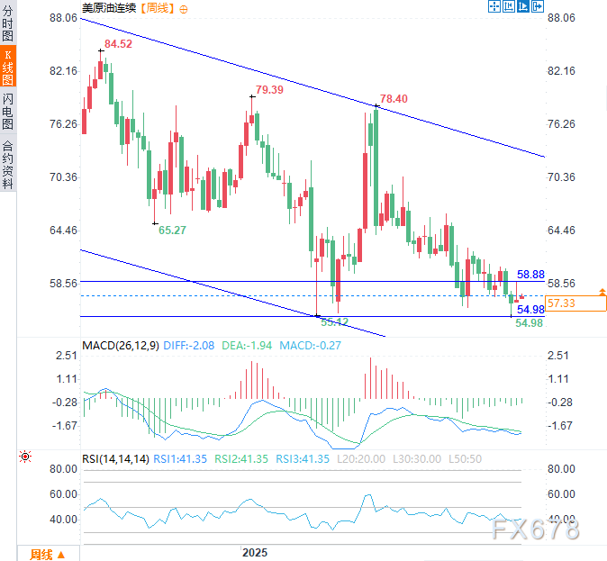 下行方面,当前周线支撑位于54.95-55.00区间,该区间含55.00整数心理关口与油价近五年低点(54.98),预计将构成首道有效支撑,需有效跌破该水平,方能加速推动油价开启下一阶段的跌势。