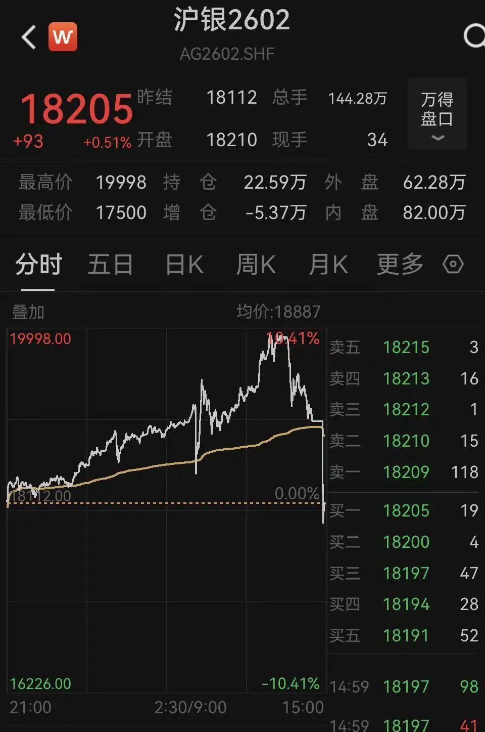 上海期货交易所白银期货主力合约AG2602早盘最高触及19998元/千克,涨幅超过10%,再创历史新高。但午后价格“高台跳水”,AG2602临近尾盘翻绿,最低触及17500元/千克,从早盘高位骤降接近2500元/千克,日内振幅高达13.79%。
