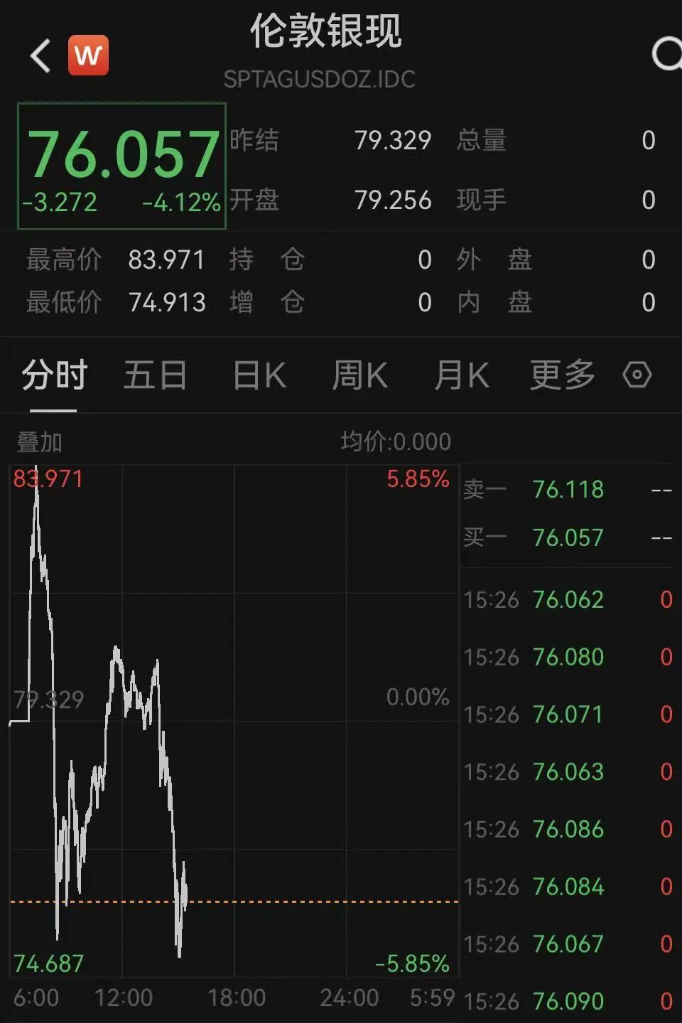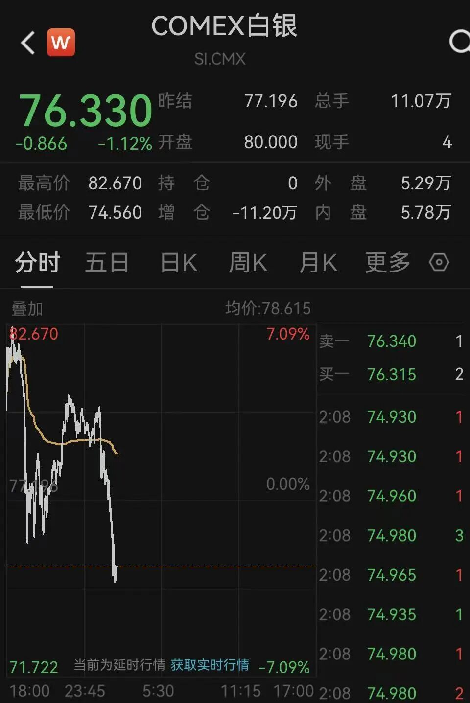国内白银期货的高波动走势,与海外相关品种的剧烈震荡是紧密联动的。伦敦现货白银价格今日也经历数轮“跳水”,从最高接近84美元/盎司,一度跌至最低约74美元/盎司;COMEX白银期货主力合约从高点82.67美元/盎司,跌至目前约76美元/盎司,振幅超过10%。