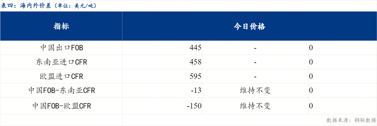 从海内外价差情况来看,中国热卷出口在445美元/吨,较上一交易日稳;欧盟进口价格595美元/吨,较上一交易日稳。
