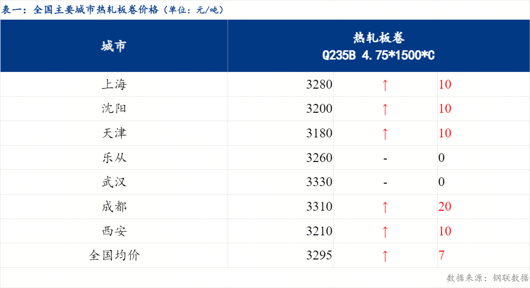 截止发稿时4.75热轧板卷全国均价3295元/吨,较上一交易日上涨7元/吨。其中主要城市价格为上海3280元/吨,沈阳3200元/吨,天津3180元/吨,乐从3260元/吨,武汉3310元/吨,成都3310元/吨,西安3210元/吨。
