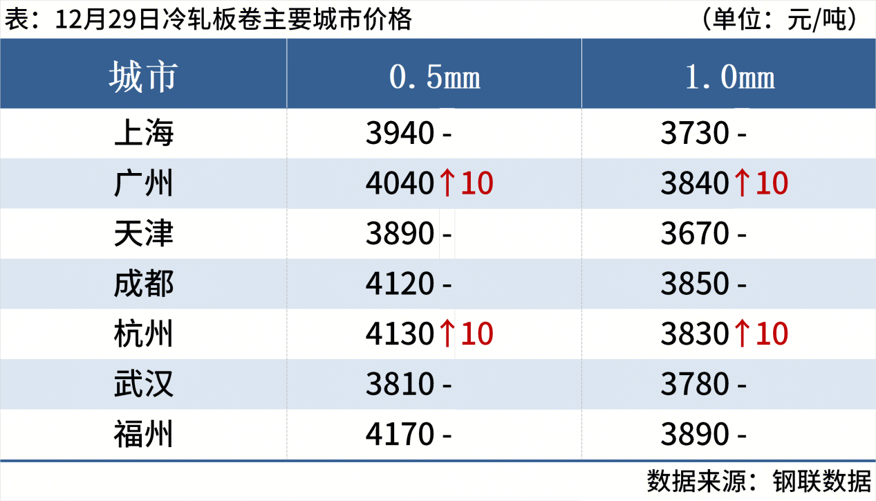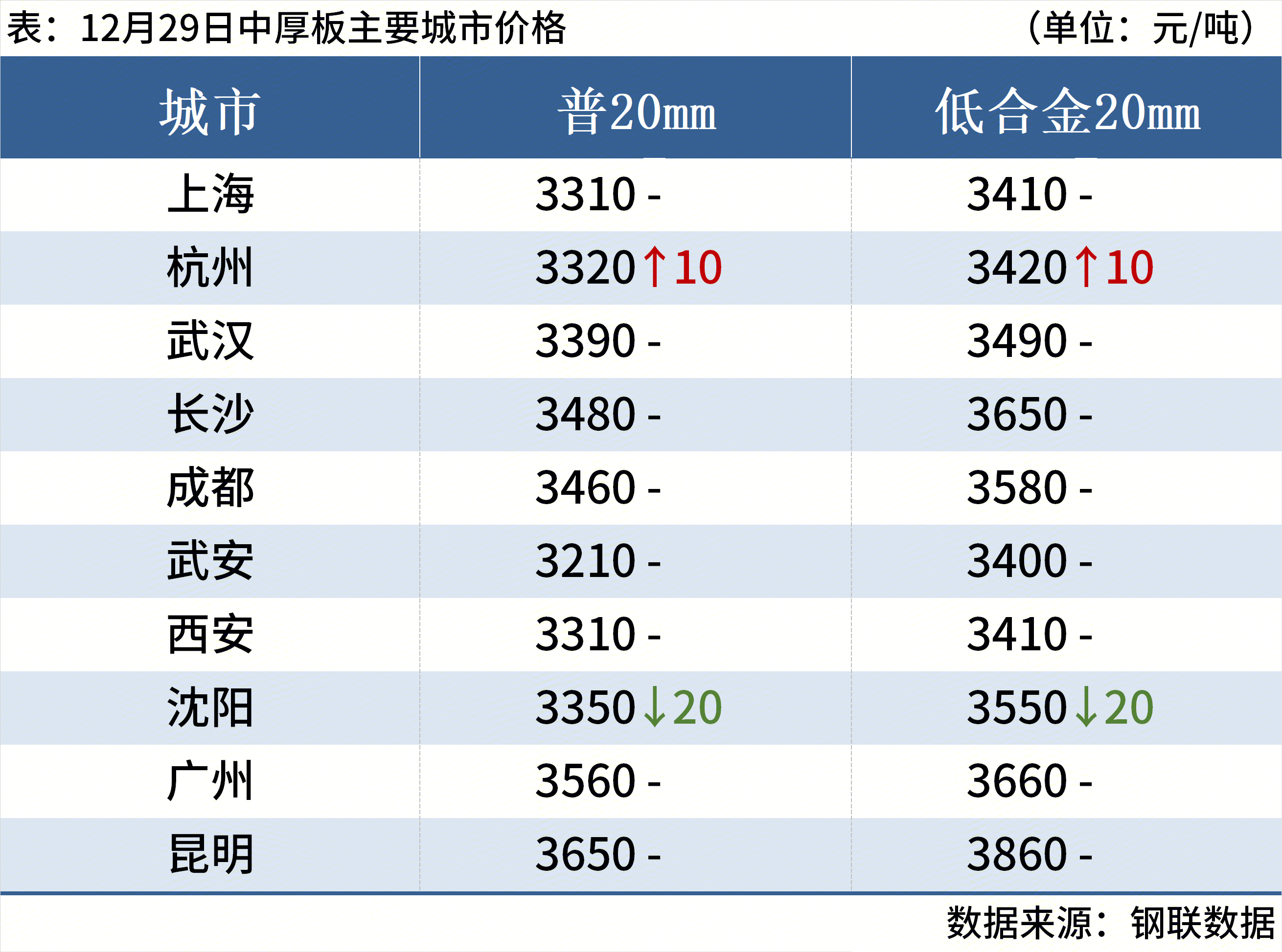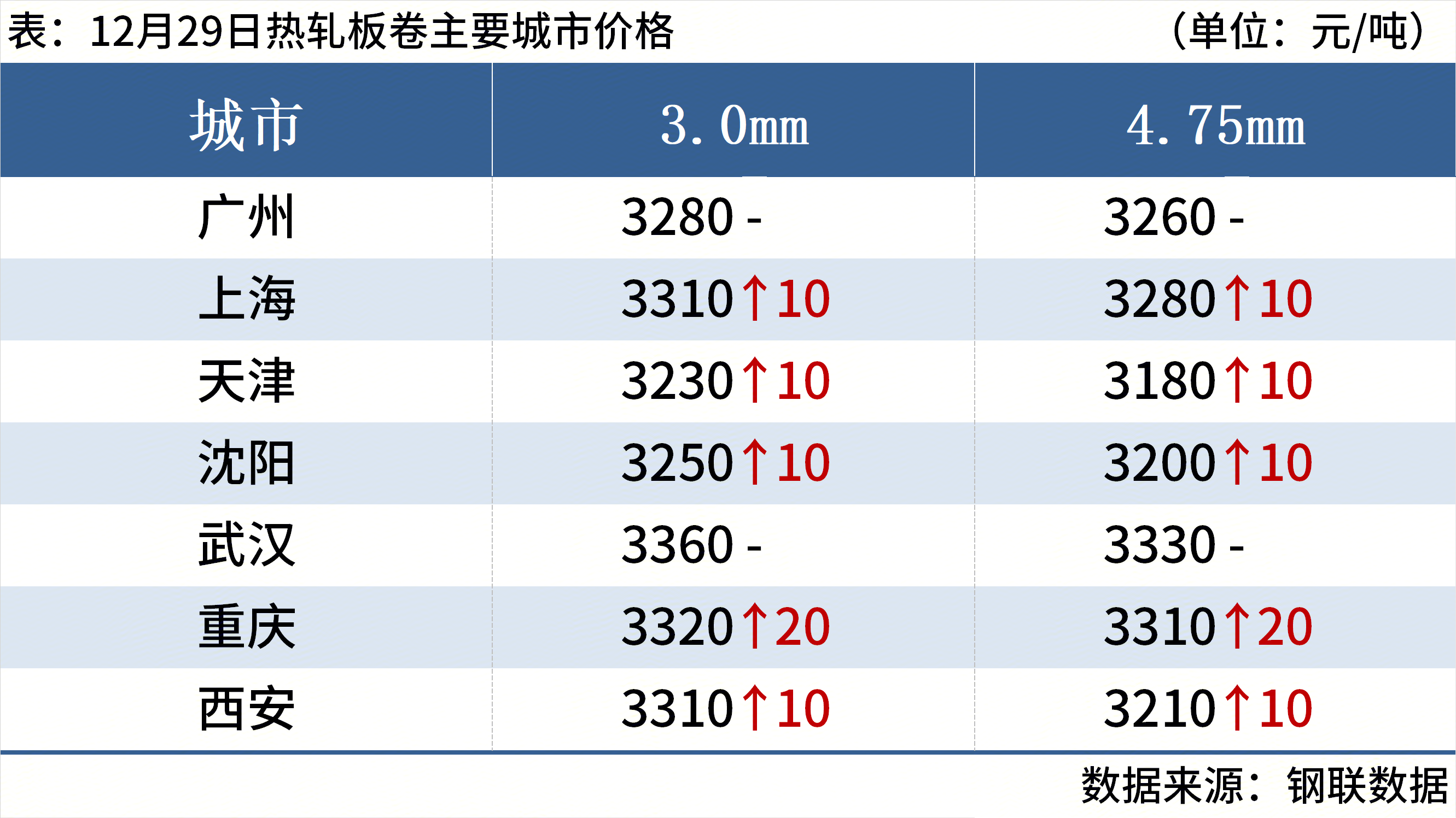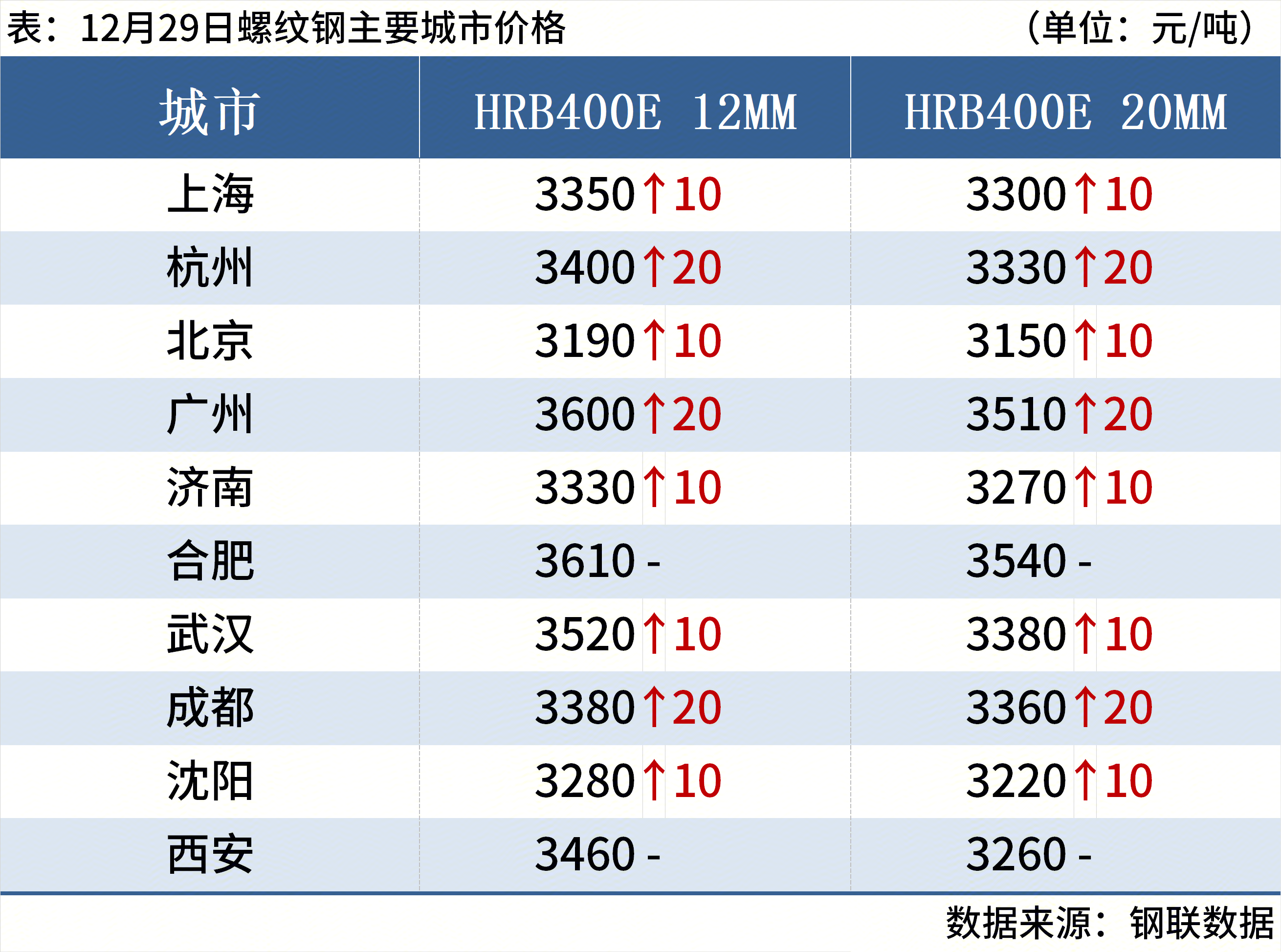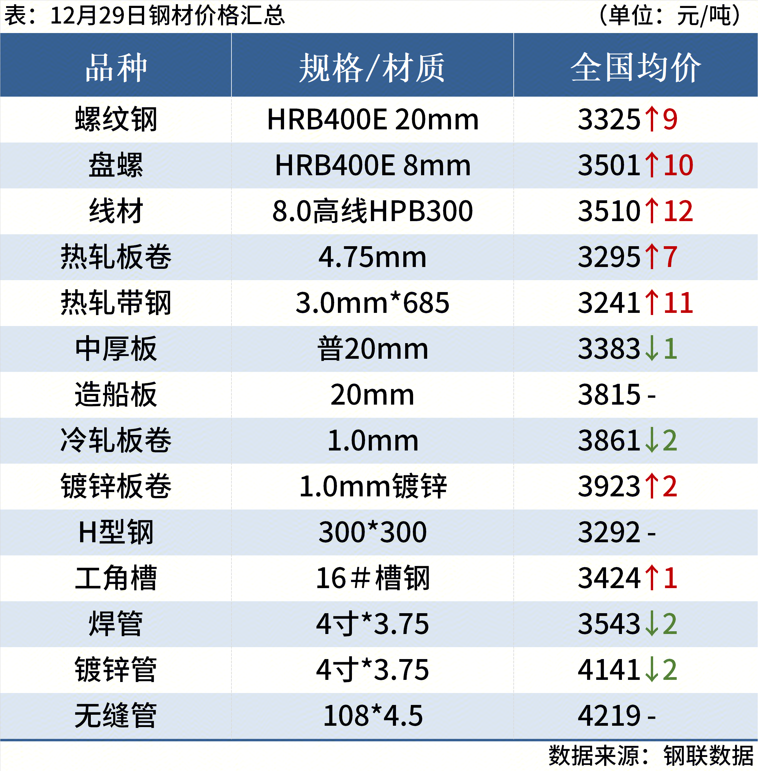 12月29日,国内钢材市场上涨为主,唐山迁安普方坯出厂含税价稳报2940元/吨。上午期螺偏强震荡,现货市场价格小幅上涨,成交尚可。午后期螺高位松动,部分商家反馈高位资源成交不畅,下游按需采购。