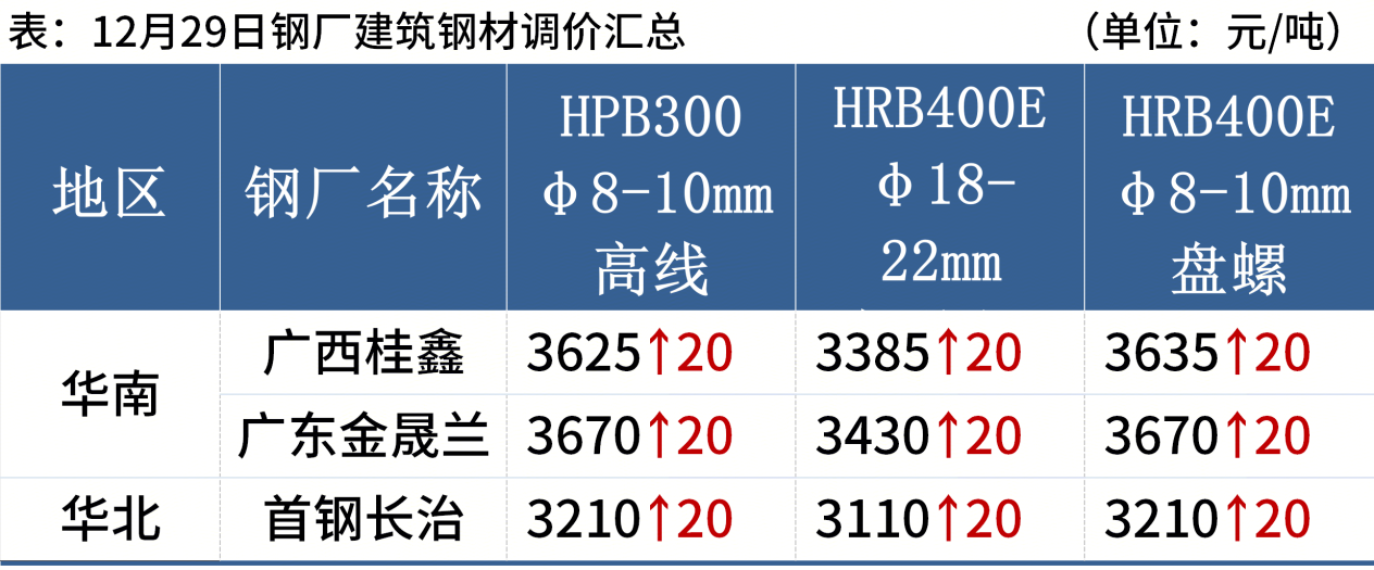 12月29日,3家钢厂建筑钢材出厂价上调20元/吨。