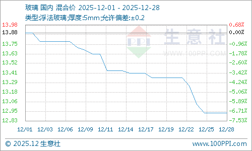 需求方面:据生意社商品分析系统显示,本周玻璃行情弱势下滑,截止12月28日市场均价在12.93元/平方米,与12月22日价格13.35元/吨相比跌幅3.15%。本周玻璃市场开工率变动不大,社会总库存有所增加,下游采买积极性不高,企业出货偏弱,玻璃库存消耗有限,玻璃价格走势下调。