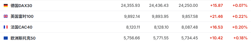2.截至发稿,德国DAX指数涨0.07%,英国富时100指数涨0.22%,法国CAC40指数涨0.20%,欧洲斯托克50指数涨0.18%。