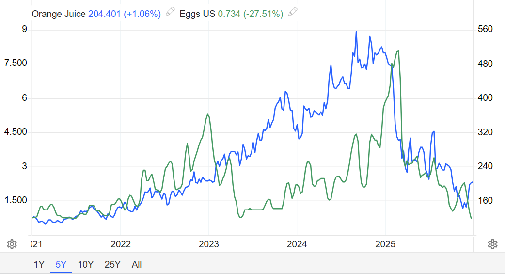 2025年回顾:这种大宗商品经历了2024年的历史性飙涨后,今年也进行了深度回调。美国鸡蛋价格大幅下跌,年初创下历史新高,随后随着季节性需求下降,以及禽流感新发病例减少,新建围栏速度快于预期,批发价格率先大幅下跌。美国鸡蛋价格跌破每打0.99美元,降至自2023年5月以来的最低水平。橙汁也逆转了去年的涨势,年初出现大幅回调;随后,巴西的橙子产量预期持续改善,价格势头继续向下;临近年底,价格出现反弹。