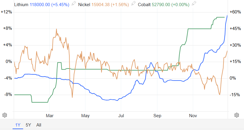 与之形成鲜明对比的是新能源电池金属——锂、钴、镍的“深水筑底”与产能出清。锂价在2025年经历了残酷的成本线保卫战,上半年碳酸锂一度跌破部分矿山成本,倒逼澳洲与非洲高成本产能关停。随着下游储能需求回升与行业“反内卷”自律减产,碳酸锂年中才在6万元/吨附近完成阶段性筑底。镍价则受印尼高压酸浸(HPAL)产能持续扩张影响,全年维持过剩格局,LME库存的激增压制了其反弹高度,年底印尼计划减产的消息才使其迎来拉升。钴价虽然走出单边下跌阴影,但由于刚果金对出口进行配额限制,供应局面转向紧张,钴价年底大幅拉升。