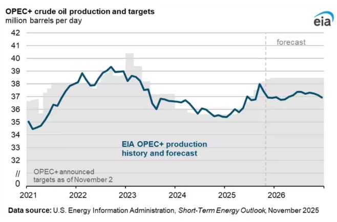 在供应端,OPEC+面临两难困境。尽管该联盟在2025年底宣布2026年一季度暂停增产,并计划将减产协议延长至年底,但此前数年积累的闲置产能释放压力依然巨大。与此同时,以美国、巴西和圭亚那为首的非OPEC+国家增产势头不减,IEA预测2026年全球总供应量将增长约240万桶/日。