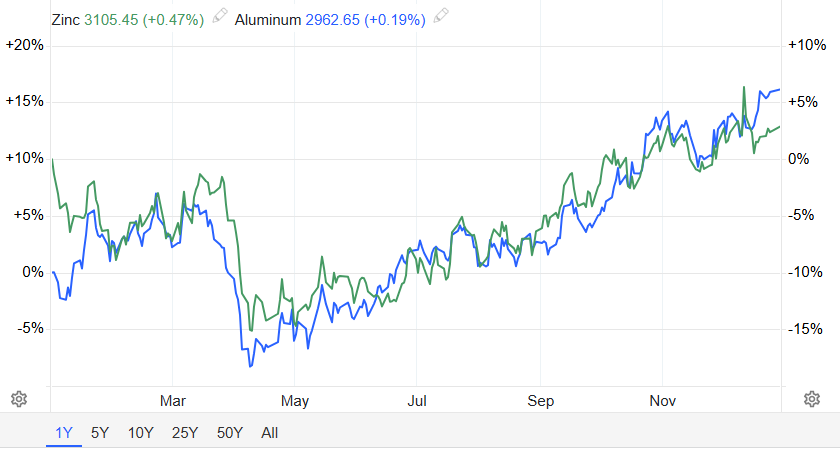 此外,铝、锌等金属在2025年更多体现了韧性。2025年,铝与锌等大宗工业金属在“成本支撑”与“需求韧性”的交织下,整体呈现高位宽幅震荡态势。铝价表现尤为坚挺,受AI数据中心需求强劲、氧化铝原材料价格高企及全球电解铝产能红线限制,价格重心维持在2500-2700美元/吨;同时,绿色低碳铝溢价在2025年显著放大。锌价呈“先抑后扬”的震荡修复走势:上半年受关税压力与供应过剩预期拖累跌至年内低位,下半年则因矿端加工费下行引发冶炼减产,叠加新能源与基建需求支撑,库存去化推动价格触底反弹,一度突破3200美元。