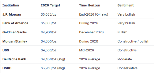 2026年展望:华尔街投行与权威机构普遍认为贵金属牛市将进入“从单边普涨向高位盘整与价值挖掘切换”的新阶段。高盛、摩根大通及美国银行等一线投行一致看好黄金延续涨势,认为全球央行战略增持、美联储降息周期及美元信用焦虑是核心驱动力,普遍预测2026年黄金均价将位于4500至4800美元之间,甚至有望冲击5000美元大关。世界银行也指出,即便涨速因基数抬高而放缓,但实物需求与避险溢价将为金价构筑坚实底部。