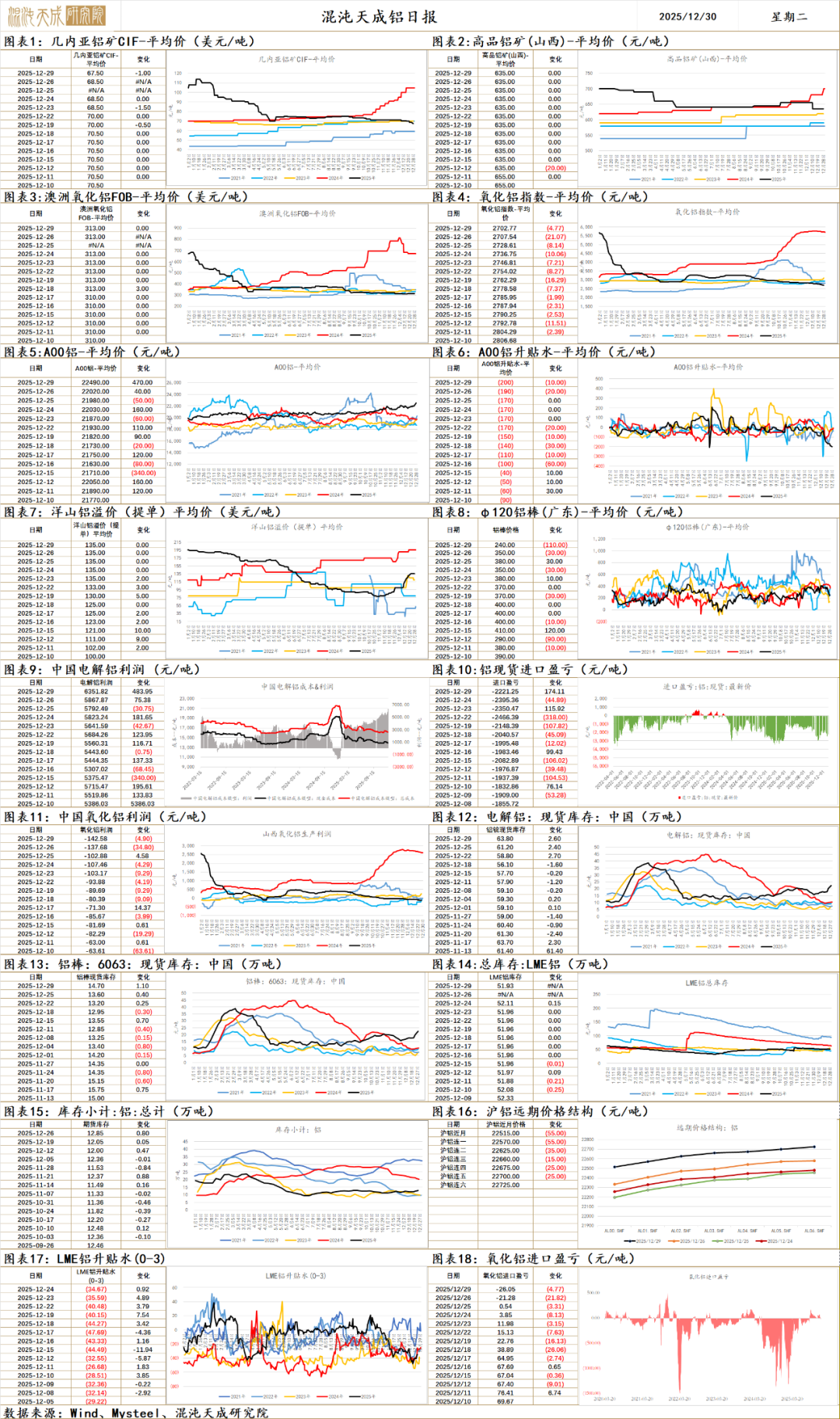 1.【2026年关税调整方案:铝产品类进口关税税率未调整】SHMET12月29日讯,2025年12月29日国务院关税税则委员会发布公告,自2026年1月1日起,对部分商品的进口关税税率和税目进行调整。其中铝产品类:氧化铝最惠国进口税率为5,2026年暂定进口关税为0;其他未锻轧非合金铝最惠国进口税率为5,2026年暂定进口关税为0;再生铝及铝合金原料最惠国进口税率为1.5,2026年暂定进口关税为0。与2025年相比,未调整。(国务院关税税则委员会)