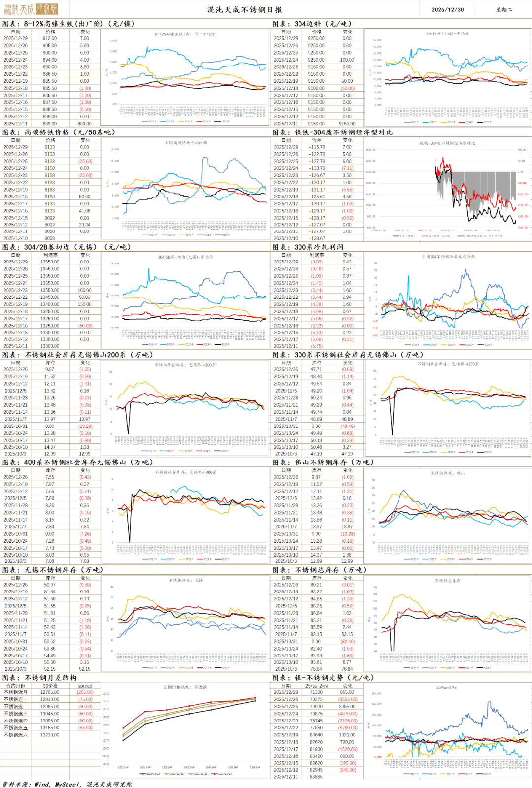 昨日不锈钢主力合约收盘价12970元/吨,涨跌幅+0.35%。无锡现货基差升水+55至540元/吨;主力合约持仓-7950至84501手;仓单-426至47462吨。