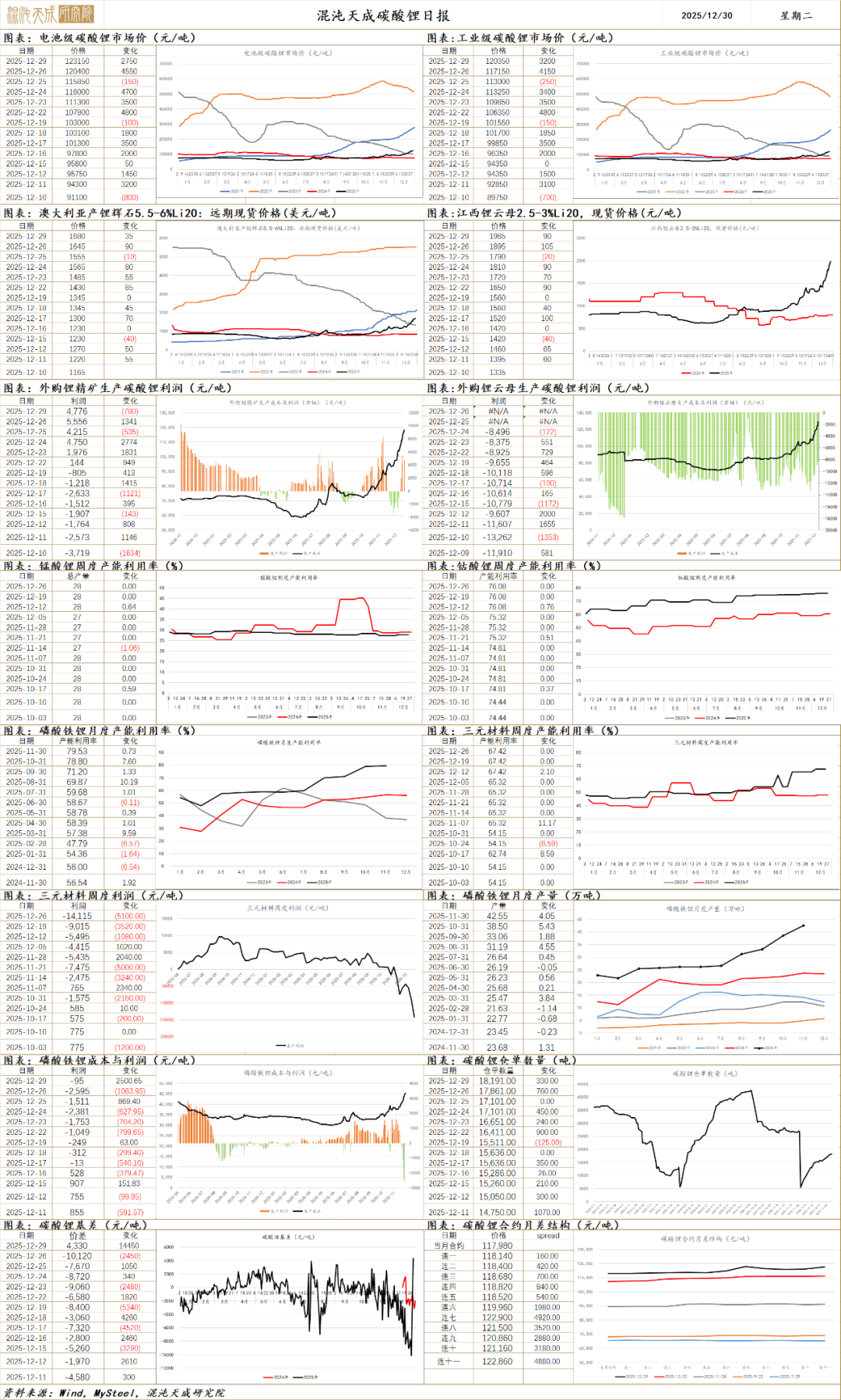 昨日碳酸锂主力合约收盘价118820元/吨,涨跌幅-7.89%。主力合约持仓-64690至512345手,仓单+330至18191吨。现货方面,电池级碳酸锂报价+2750至123150元/吨,工业级碳酸锂报价+3200至120350元/吨。锂精矿均价+50至1565美元/吨。
