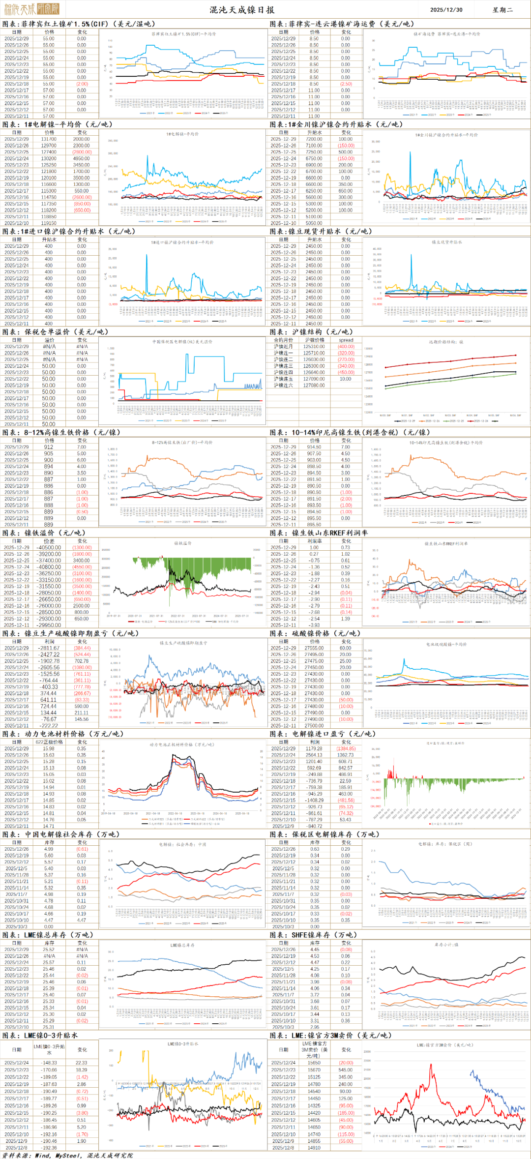 2、【市场成交转淡 精炼镍社会库存维持高位】据Mysteel调研统计,截止12月26日,中国精炼镍27库社会库存减少263吨至56725吨,降幅0.46%;仓单库存减少75吨至37527吨;现货库存减少188吨至15228吨,其中镍板减少188吨,镍豆持平;保税区库存持平至3970吨。上涨镍价大幅上涨,下游观望情绪整体偏浓,精炼镍现货成交周内转淡,社会库存保持稳定。(Mysteel)