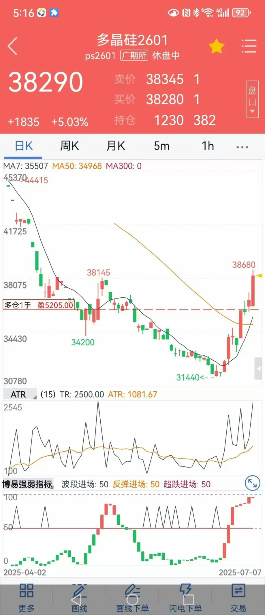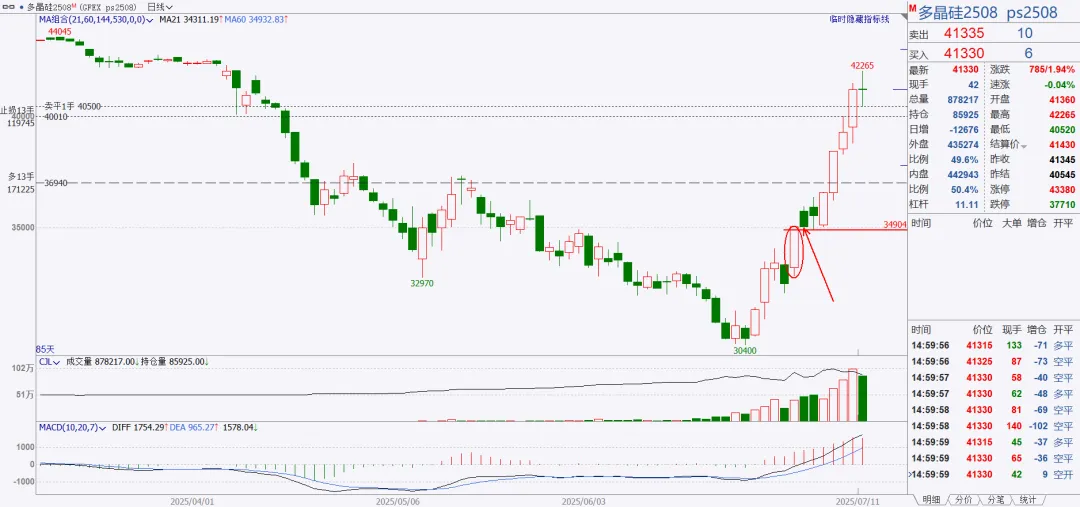 比如近期的多晶硅行情,从30400元/吨涨到41600元/吨,涨幅超过36%。有人在35000元/吨时进场,有人却在31000元/吨左右时就布局——这就是拐点交易的魔力:在行情启动前找到“黄金入场位”。我在这个位置不断地加仓上去获利已经1倍了。