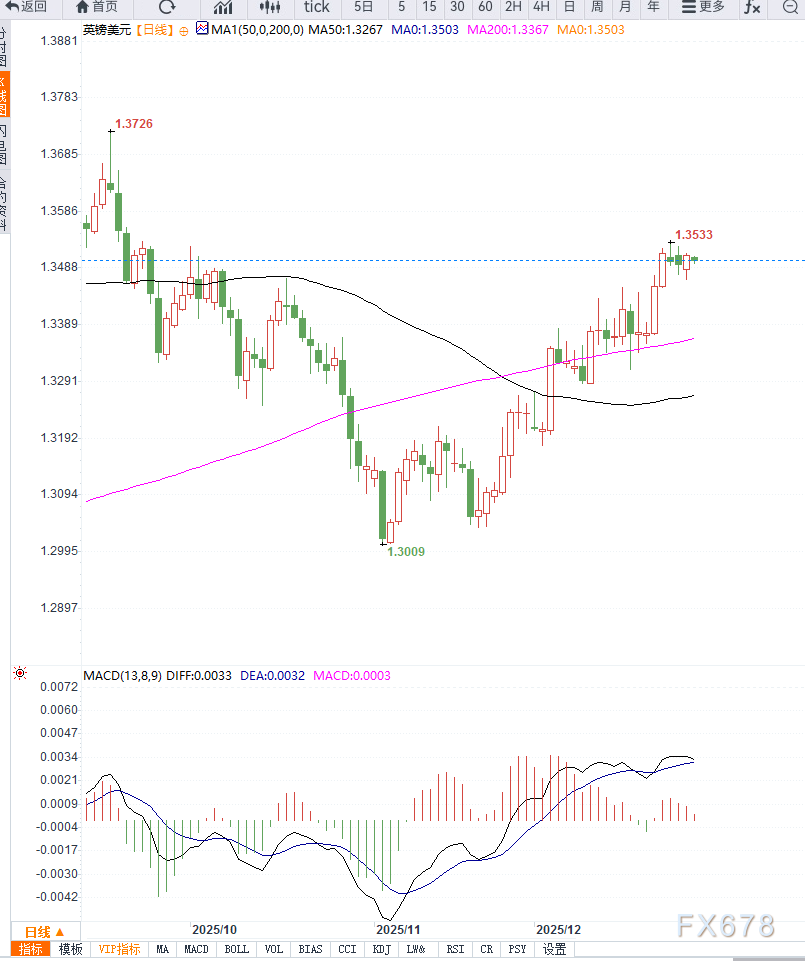 RSI维持在60附近,未出现明显超买信号,显示多头仍占据主动,但追高动能有限。在缺乏强势基本面催化的情况下,GBP/USD短期更可能维持1.3450—1.3650区间震荡。