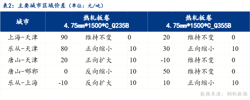 从区域价差来看,4.75mm普卷华南与华北价差80元/吨,华东与华北价差90元/吨,华南与华东价差-10元/吨。京津冀地区价差来看,唐山与天津价差20元/吨,唐山与邯郸价差持平。