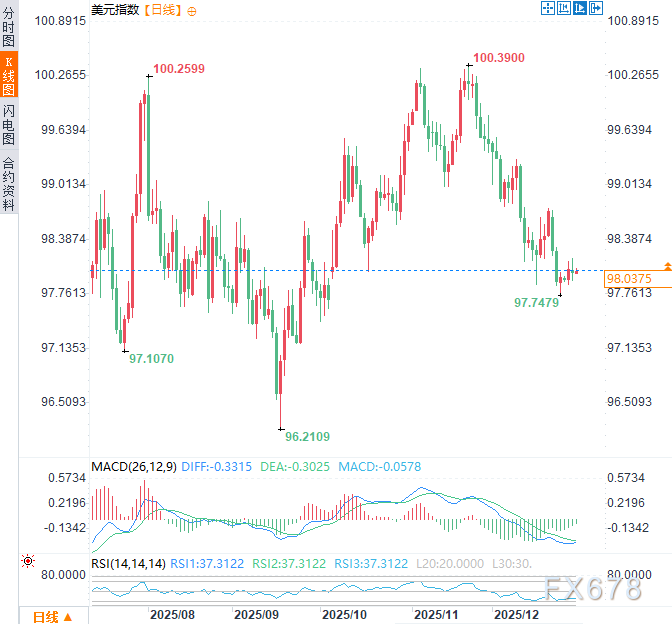 周二(12月30日)美元指数于98.05附近震荡。美元预计可能后续因政策不确定性和对美联储独立性的担忧而承受压力。