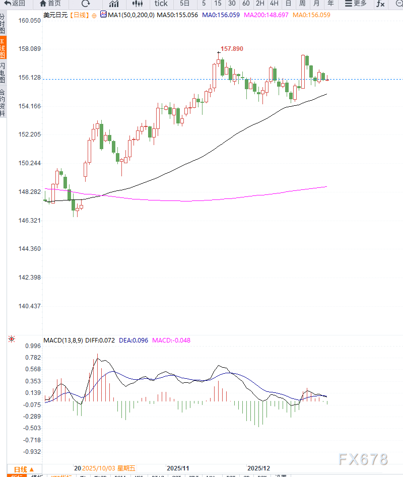 美元兑日元近期走势反映了政策分化逻辑:日本央行维持紧缩路径支撑日元承压,而美联储降息预期限制美元单边上涨。短期内,汇价更可能延续高位震荡格局,关注156.00-156.50区间的支撑与阻力位,待政策信号明朗后再择机顺势操作。
