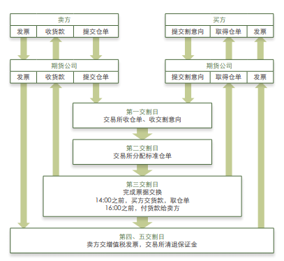 实物交割应当在合约规定的交割期内完成。交割期是指该合约最后交易日后 的连续五个工作日。该五个交割日分别称为第一、第二、第三、第四、第五交割 日,第五交割日为最后交割日。交割程序如下图: