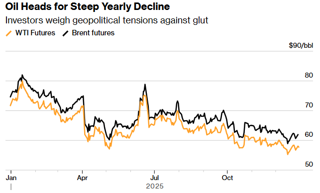 交易员们正在权衡从委内瑞拉到俄罗斯和伊朗的地缘政治紧张局势,油价因此保持上涨。布伦特原油周一上涨2.1%后,稳定在每桶62美元附近,而WTI原油则高于每桶58美元。面对美国的部分封锁,委内瑞拉已开始关闭其拥有全球最大油田地区的油井,该封锁限制了原油出口,导致当地储油罐全满。另据报道,美国总统特朗普称,美国袭击了委内瑞拉境内的一处设施。