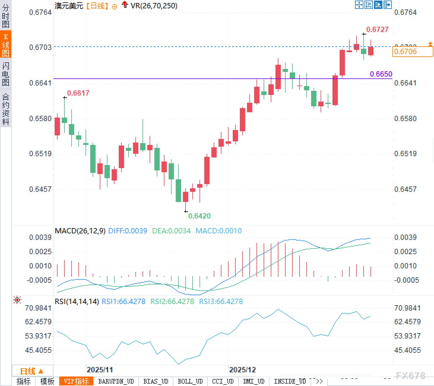 汇通财经APP讯——周二(12月30日),澳元兑美元在欧洲时段小幅走高,盘中围绕0.6700附近交投。过去一个多月里,汇价从0.6420一线的阶段低点持续抬升,短线已经进入“趋势延续与高位消化并存”的状态:多头仍占上风,但上方阻力开始变得密集,任何关于利率预期的细微变化,都可能放大日内波动。