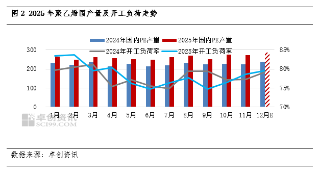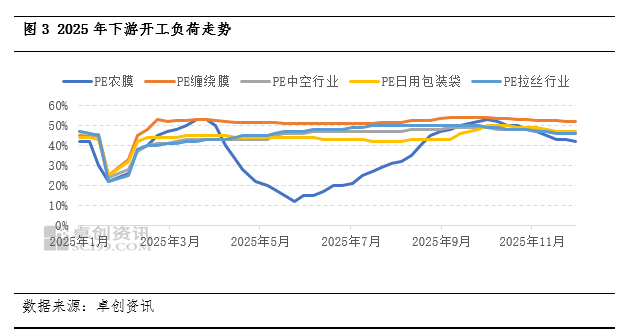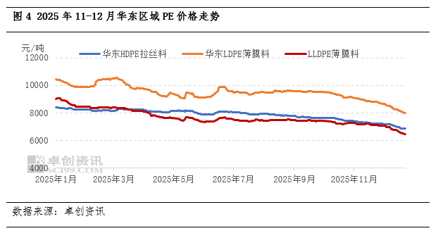 12月份,国内聚乙烯下游各主要行业开工负荷普遍呈现小幅下降趋势,利空现货市场价格。具体来看,北方棚膜生产进入收尾阶段,订单持续缩减;地膜虽处淡季,但部分招标订单提供零星支撑,开工率下滑3个百分点至42%;包装膜方面“双十一”旺季结束后,“双十二”及元旦节前备货的提振作用有限,整体需求稳中趋弱,开工下滑2个百分点至47%;注塑及其它制品普遍下滑。综上所述,农膜受季节性影响最大,是需求减量的主要领域;包装膜虽有短期节日因素,但提振乏力;其他制品行业也同步走弱。在整体“供强需弱”的格局下,下游疲软的需求是导致聚乙烯价格持续承压下行的重要原因之一。