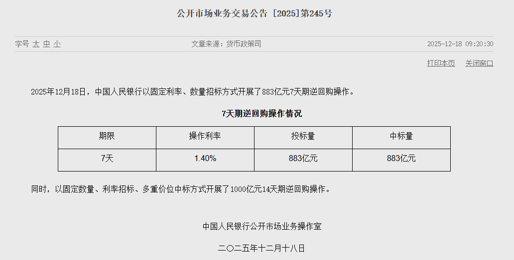 12月18日,央行、开展883亿元7天逆回购操作,操作利率为1.40%,与此前持平。同时,央行以固定数量、利率招标、多重价位中标方式开展了1000亿元14天期逆回购操作。因18日有1186亿元7天期逆回购到期,当日实现净投放697亿元。