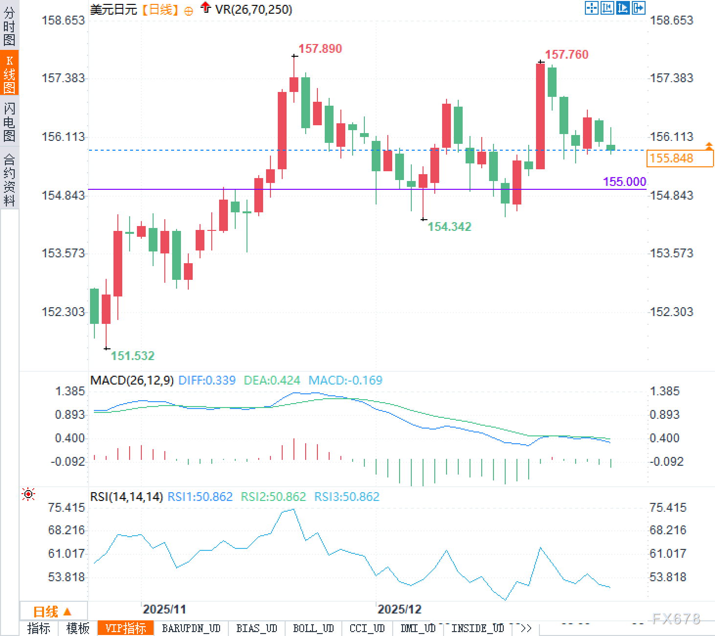 汇通财经APP讯——12月30日,星期二。年末假期前后市场交投偏清淡,汇市更容易被政策预期与措辞变化牵动。美元兑日元欧洲时段小幅回落至155.850附近。表面看只是窄幅波动,但背后其实是两条主线在拉扯:一条来自日本央行对后续加息路径的再确认,另一条来自美联储降息节奏进入再评估窗口,叠加市场对未来政策沟通与人事变量的敏感度上升。短线的“轻微走弱”,更多像是对信息的再定价,而非单一方向的宣告。