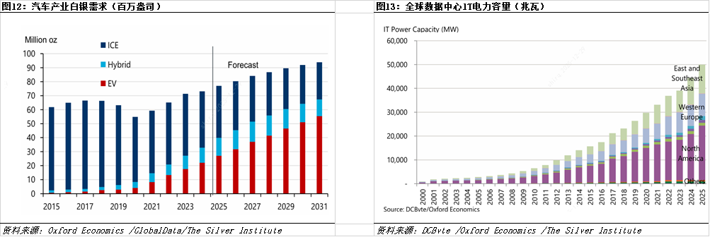据世界白银协会最新报告,汽车行业持续向电动化转型,纯电动汽车(相对于混合动力汽车和内燃机汽车)每辆车对白银的巨大消耗量,以及轻型汽车对电子控制单元(ECU)的更高需求,总体上预示着汽车行业对白银的需求前景乐观。总体而言,我们预测2025年至2031年间,汽车行业对全球白银的需求将以3.4%的复合年增长率增长,到2031年将达到约9400万盎司。2024年,内燃机汽车占白银需求的55%,电动汽车以30%位居第二。电动汽车需求和产量的快速增长意味着,预计到2027年,电动汽车的产量将超过内燃机汽车,成为汽车行业白银需求的主要来源,到2031年,电动汽车将占59%的市场份额。预计随着电动汽车的市场份额的增加,电气和电子部件的使用将使白银需求显著提振。