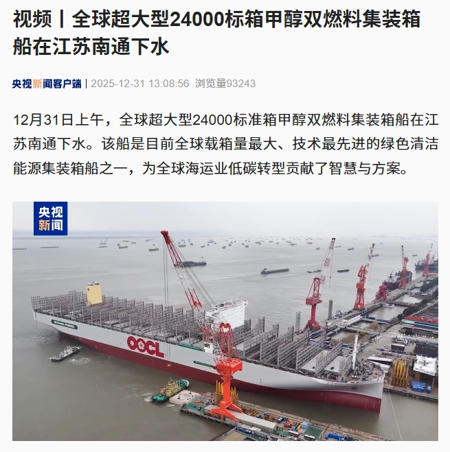 IT之家 12 月 31 日消息,据央视新闻今日报道,12 月 31 日上午,全球超大型 24000 标准箱甲醇双燃料集装箱船在江苏南通下水。该船是目前全球载箱量最大、技术最先进的绿色清洁能源集装箱船之一。