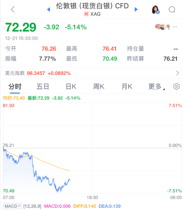 12月31日,贵金属大跌,现货黄金一度跌1.50%,现跌0.13%;现货白银一度跌超6%,现跌5%;现货铂金、现货钯金大幅下跌。即便在周三下跌之后,白银的表现仍优于大多数资产,今年飙升147%。贵金属今年表现强劲,黄金和白银均有望创下自1979年以来的最佳年度涨幅。