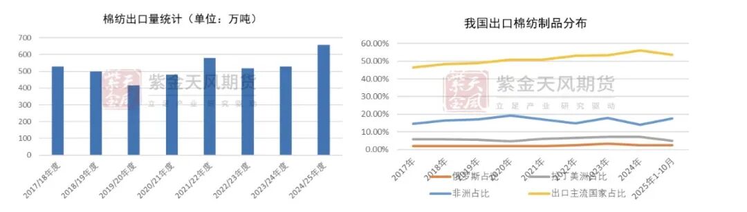 后期价格反转上行,也是戏剧性的。悲观的市场发现,高昂的关税并没有阻隔我国的出口。我国通过拓展新的出口市场,如拉美、非洲、东南亚,以及下降单价维持和拓展市场份额,出口反而也成为2025年拉动我国GDP的重要引擎。在这个过程中,棉纺出口表现也较为亮眼。2024/25棉纺总消费同比增0.68%,其中出口同比增长24.25%,2024/25年度内销明显偏弱,预计同比23/24年度下滑35.7%。超预期的出口表现带动了棉花消费的持续,盘面价格回归14000元/吨附近。