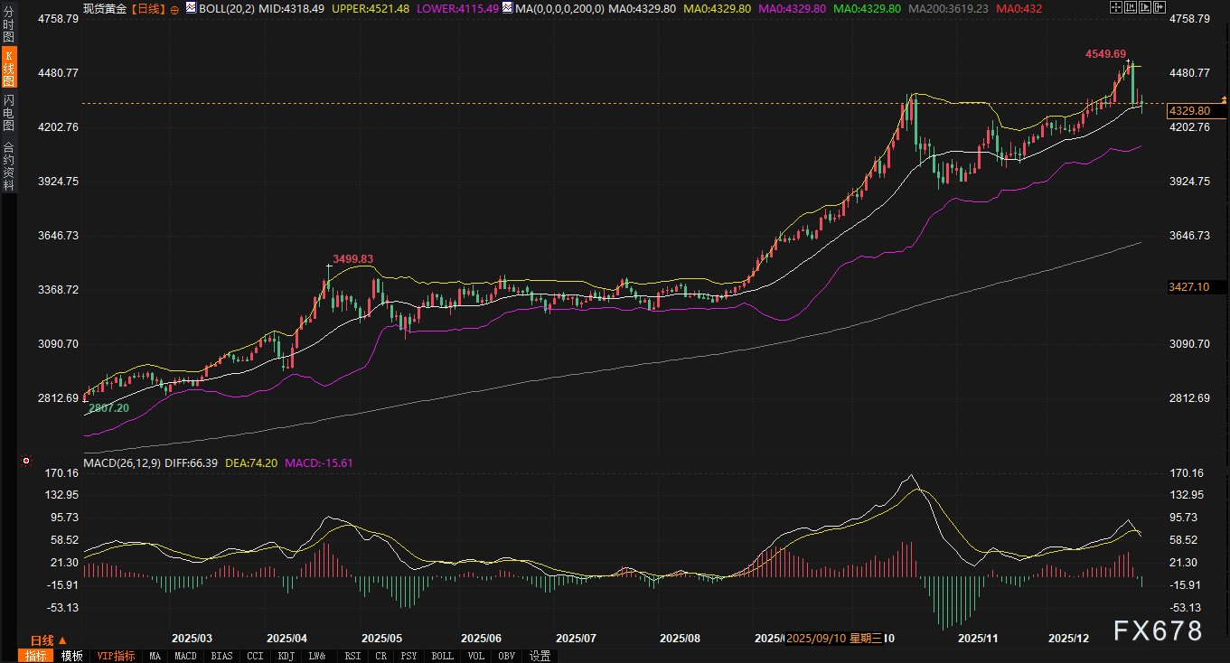 年末时点往往伴随着机构投资者的仓位调整、利润了结和风险管理操作。在黄金经历了创纪录的年度涨幅后,这种季节性效应可能被放大。从技术图形上看,价格在创出新高后未能延续强势,反而在布林带上轨附近遇阻回落,且回落过程中伴随着成交量能的相对萎缩(假期因素),这符合典型的“创新高后技术性回调”特征。