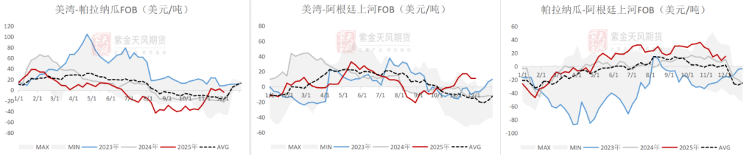明年上半年消耗25/26季美豆,若单产进一步下修,则美豆贴水有进一步反弹可能。9-10月为新作集中上市,季节性供应上量,贴水往往走弱,11-1月随着出口及压榨推进,供应压力缓解,贴水可能回升。25年中美贸易摩擦中,中国连续多月未采购美豆,新增需求转向南美大豆,北美-南美FOB差创下历史新低。中美贸易关系缓和下,美豆贴水贵于巴西,改变倒挂局面。