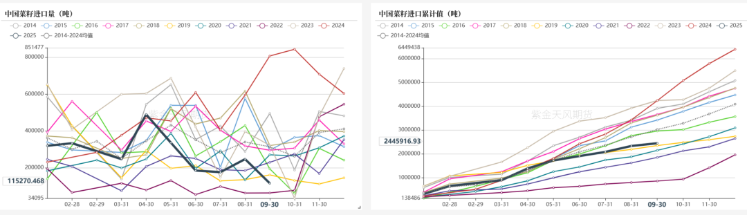 (4)9月中下旬为宏观预期转变与情绪转换,豆粕、菜粕价格联袂下跌,趋势较为顺畅。中美经贸会谈取得积极进展,虽美豆与巴西大豆相比缺乏性价比,但市场对中国出于政治任务采购新季美豆的预期增强,叠加国内进口大豆抛储传闻,共同缓解了国内对26年一季度大豆供应紧张的担忧,导致此前交易“供应缺口”的逻辑松动。同时,国内对澳大利亚菜籽的采购预期增加,也削弱了菜粕的供应端支撑。