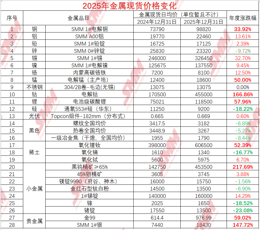 编者按:岁序更替,华章日新。伴随着 2026 年的脚步日益临近,2025 年金属现货市场的征程已圆满收官。复盘全年金属现货价格表现来看,黑钨精矿以217.69%的亮眼涨幅摘得年度桂冠,电解钴以166.86%的涨幅稳居次席,SMM 1# 银则凭借147.72%的涨幅位列第三。
