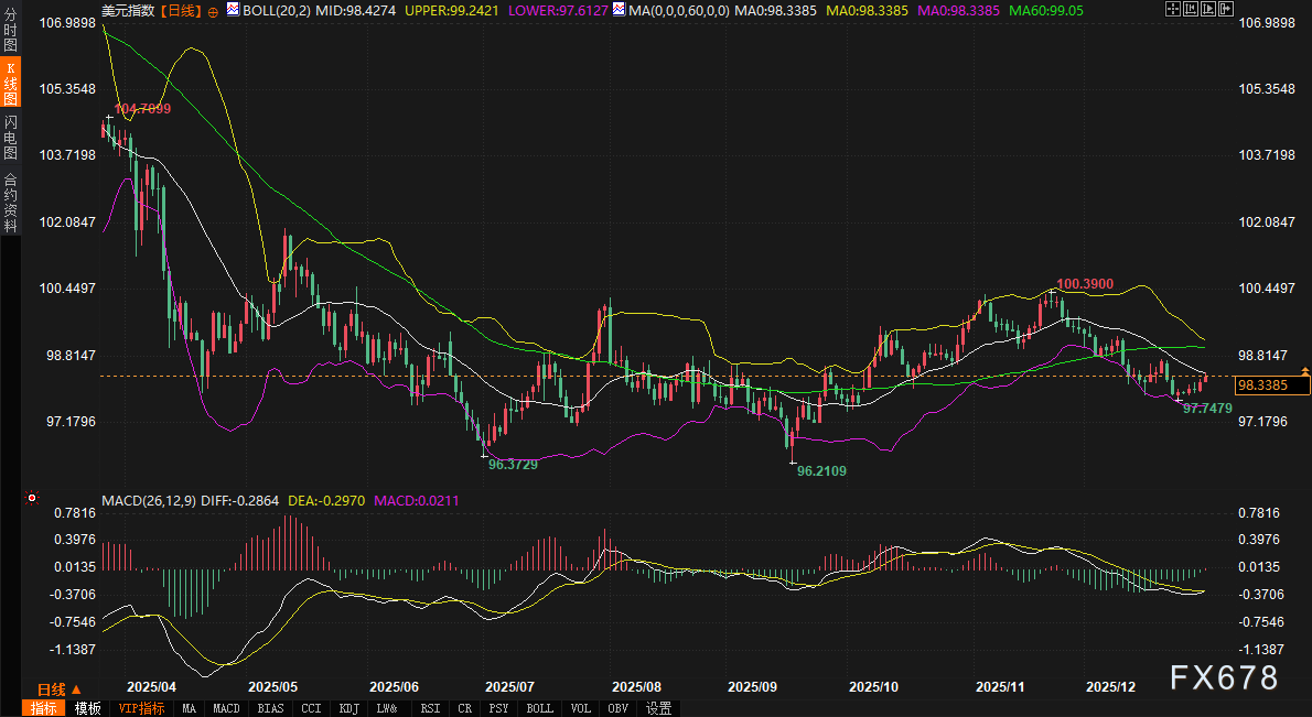 从技术指标分析,美元指数目前正处于一个敏感的三角收敛区域。日线图上,布林带(20,2)中轨位于98.43,上轨与下轨分别位于99.24和97.61,指数当前价格紧贴中轨下方,波动率有所收窄。MACD指标(参数26,12,9)显示,DIFF值为-0.2866,DEA值为-0.2970,柱状线为0.0212,指标在零轴下方有形成微弱金叉的迹象,但整体动能依旧偏弱,暗示反弹力量不足。