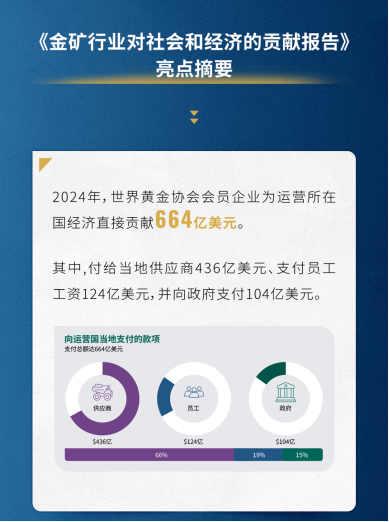 近日,世界黄金协会如期发布了《金矿行业对社会和经济的贡献报告》2025,这已是该机构连续第五年系统量化全球领先金矿企业的社会经济贡献。最新数据显示,仅2024年一年,协会旗下28家会员企业就为其运营所在的36个国家和地区直接贡献了664亿美元的经济价值。当我们仔细拆解这664亿美元的资金流向时,可以发现其对社会经济产生的重要影响。
